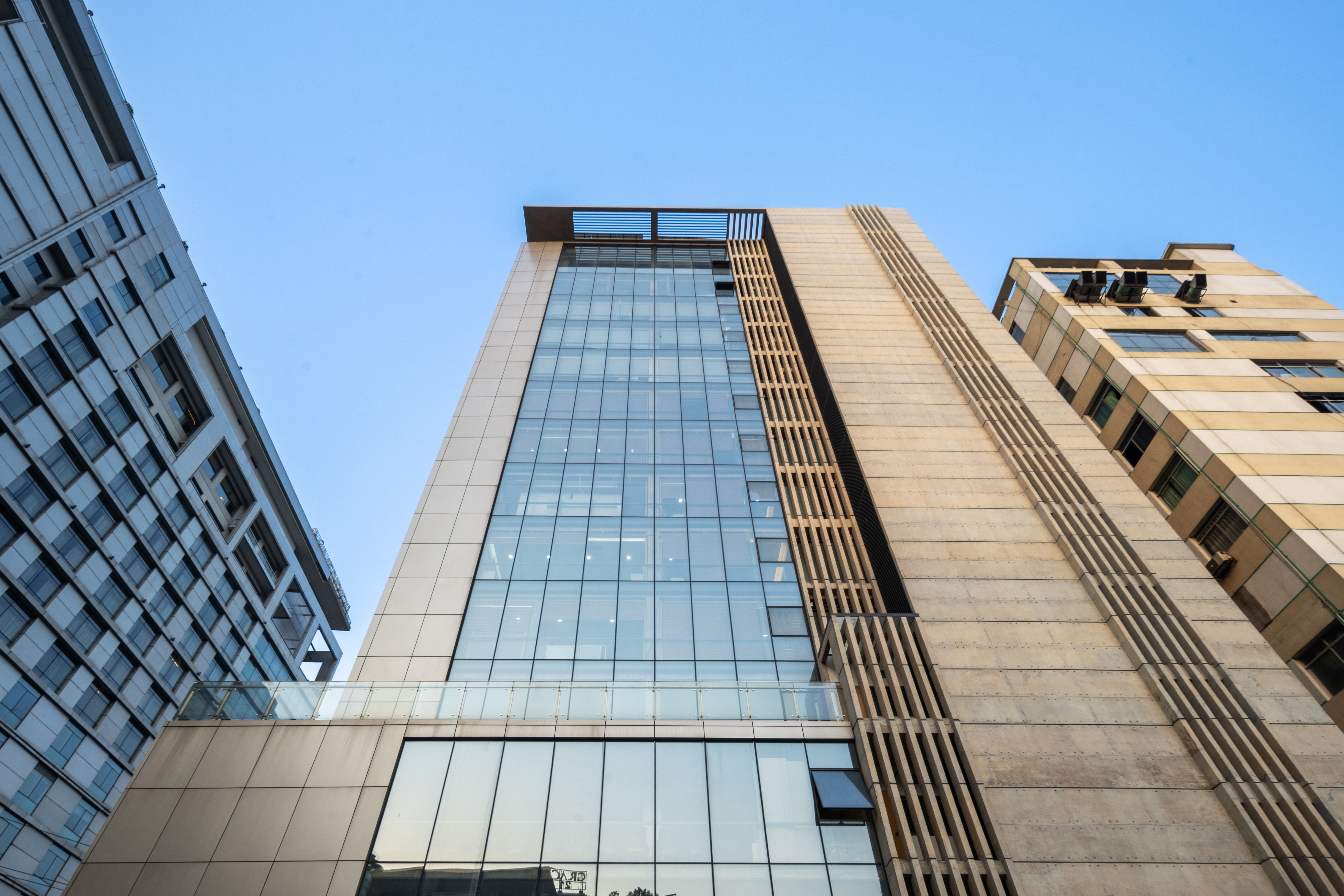 Approached the main thoroughfare, the form seems to be a play of planes layered within. A hierarchy of tactility expresses itself in these planes, beginning with a concrete plate that folds at the crown, and followed within with planes of glass and louvered screens that fold at intervals.