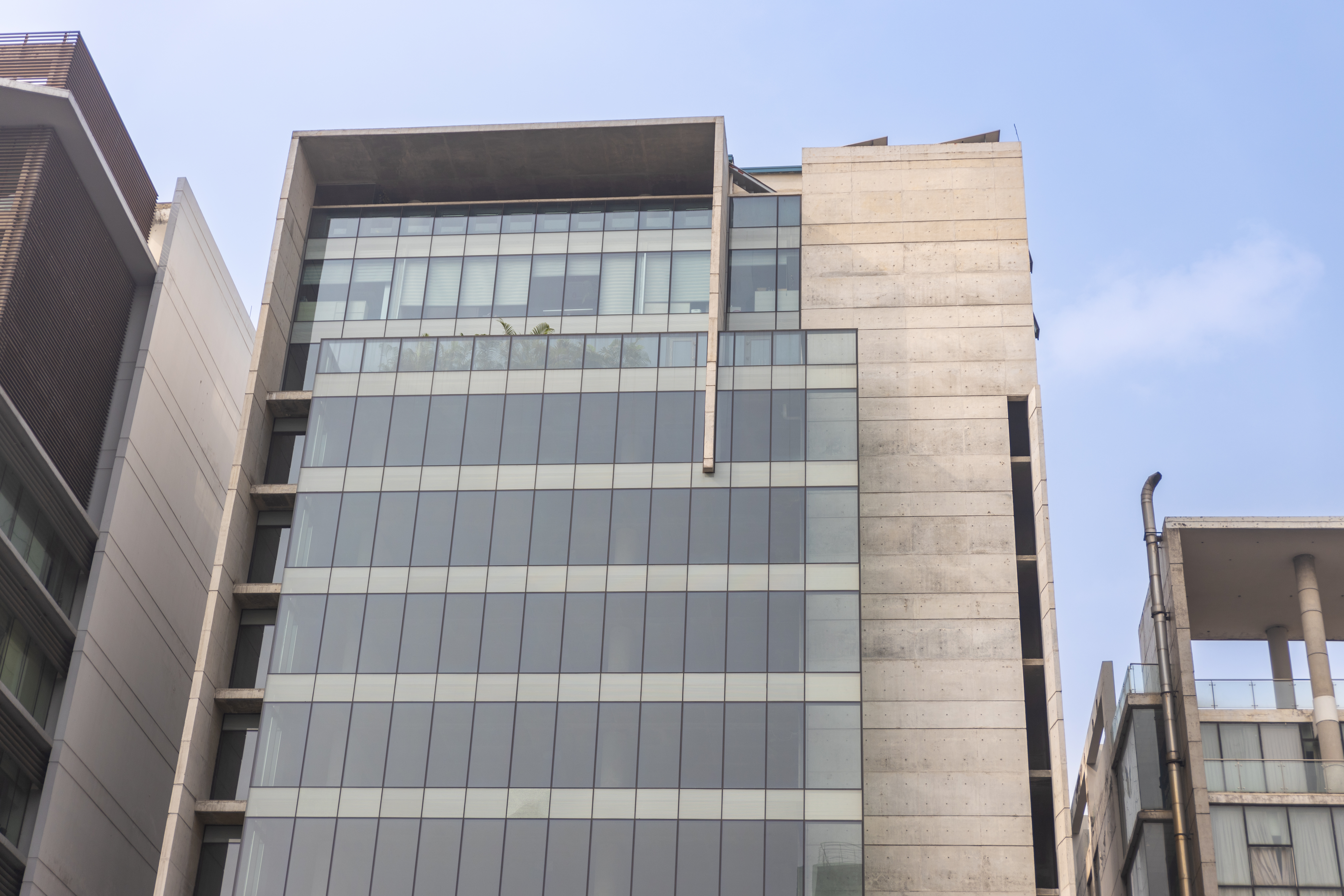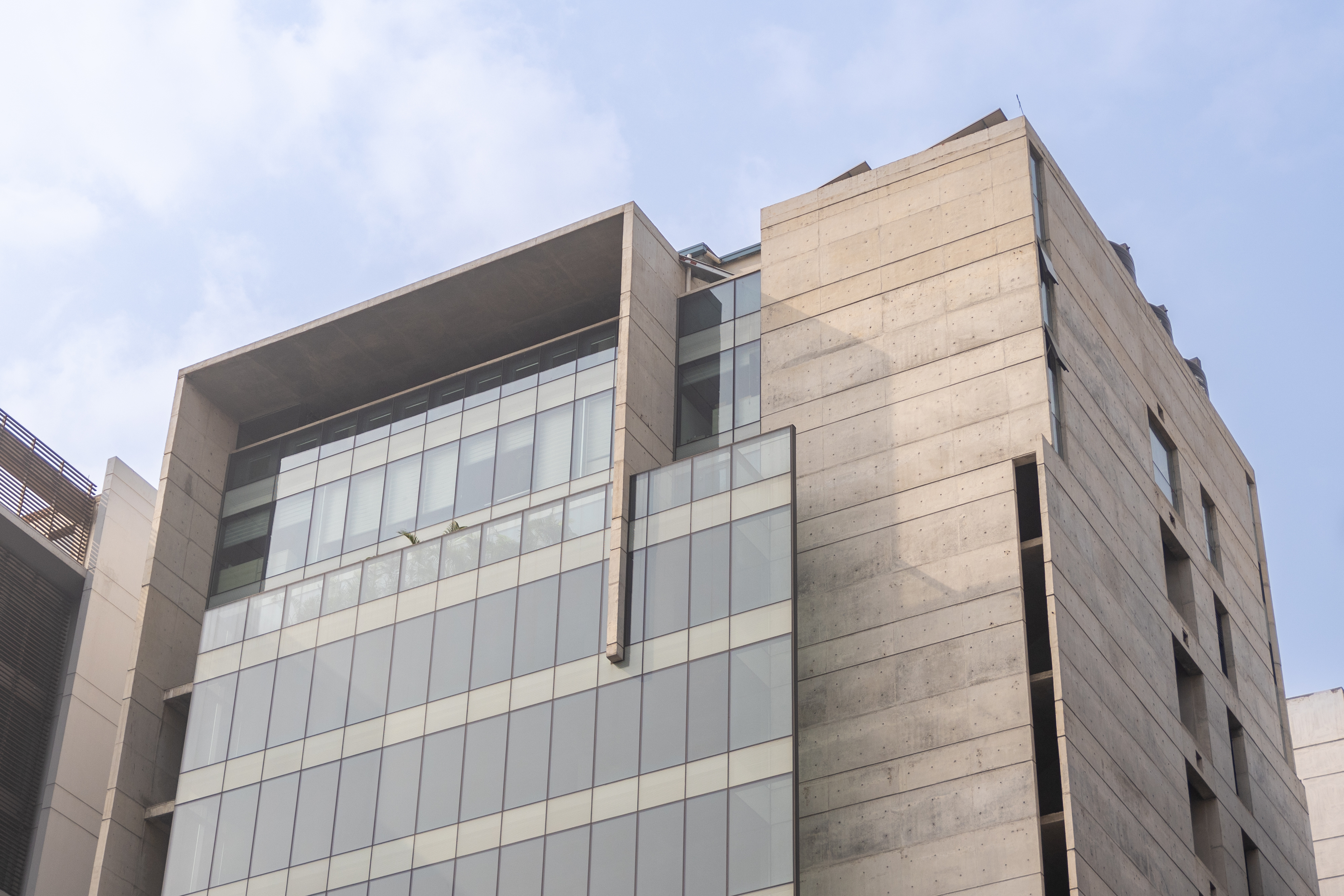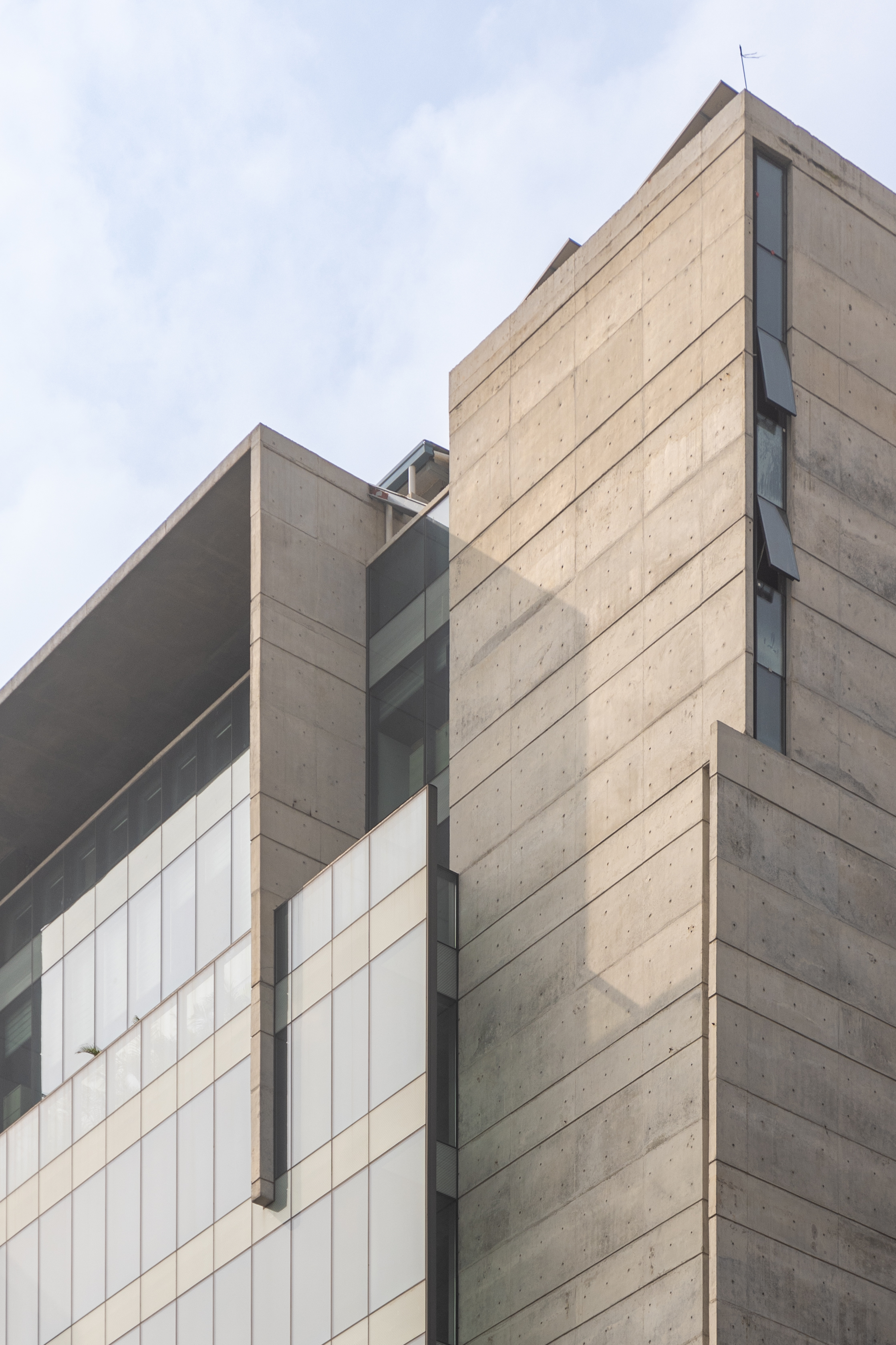 Approached the main thoroughfare, the form seems to be a play of planes layered within. A hierarchy of tactility expresses itself in these planes, beginning with a concrete plate that folds at the crown, and followed within with planes of glass and louvered screens that fold at intervals.